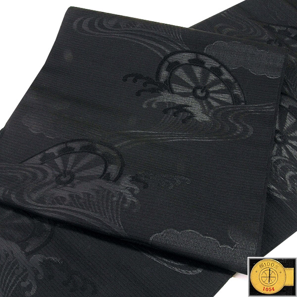 ■喪服帯 夏物 絽 京都西陣織 宮崎機業店謹製 黒共帯 片輪車文様 黒色 九寸 正絹 名古屋帯■ [z96]
