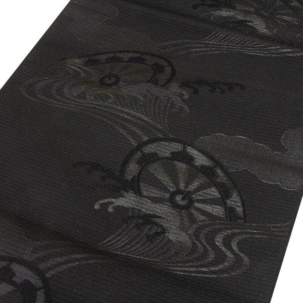 ■喪服帯 夏物 絽 京都西陣織 宮崎機業店謹製 黒共帯 片輪車文様 黒色 九寸 正絹 名古屋帯■